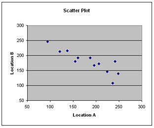 The scatter plot in this example shows the amount of sales per month generated at two locations of a chain grocery mart for the past year. The X-scale shows the sales (in thousand dollars) for Location A while the Y-scale represents the corresponding sales for Location B. The plotted points form a negative slope - the sales at location B is inversely related to the sales at location A.